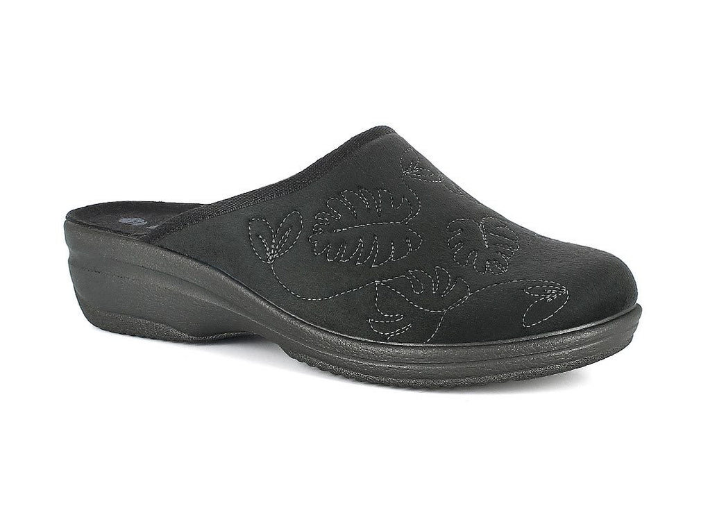 Juodos spalvos, švelnaus mikropluošto audinio moteriškos šlepetės, puoštos siuvinėtu gėlių raštu.