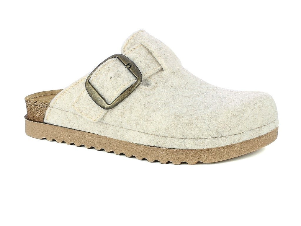 Modernaus dizaino šviesiai rudos spalvos moteriškos šlepetės iš ekologiško veltinio, lanksčiu pastorintu padu, papuoštos sagtimi. Šlepečių paminkštintas vidpadis iš natūralios odos užtikrins, kad jaustumėtės patogiai.