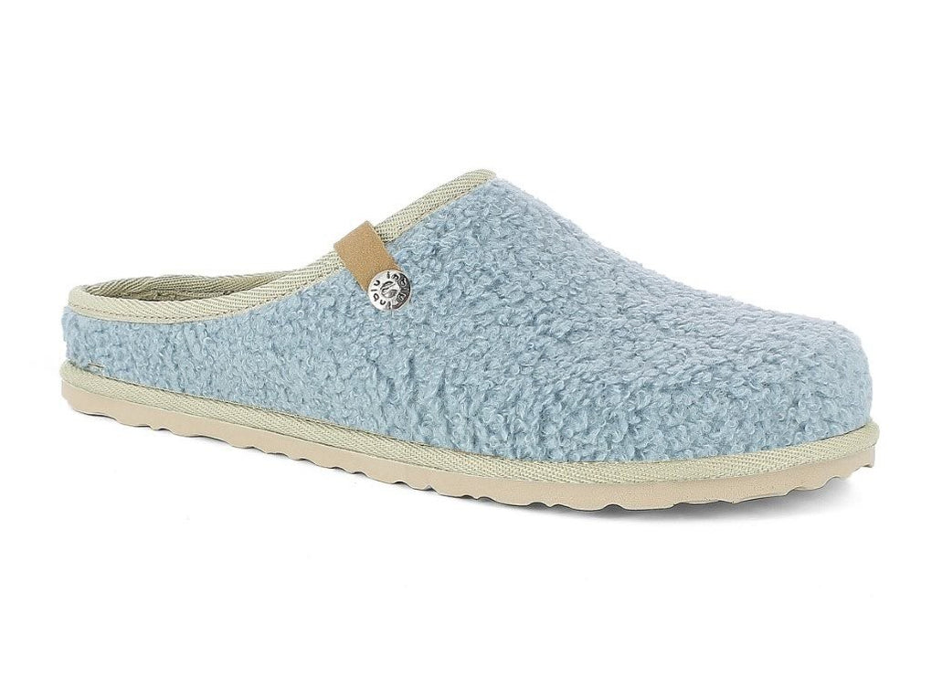 Šviesiai mėlynos spalvos, Teddy pliušinį kailiuką primenančio audinio moteriškos šlepetės. Šlepečių paminkštintas vidpadis iš natūralios odos, lengvai išimamas, tad jas bus itin paprasta prižiūrėti.